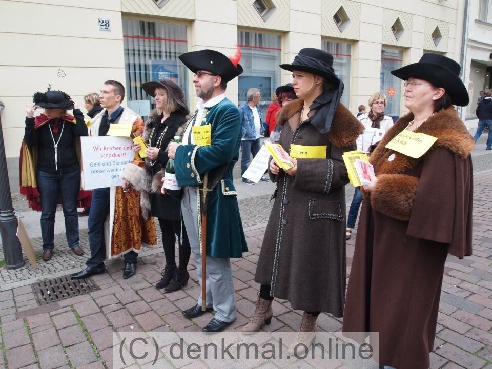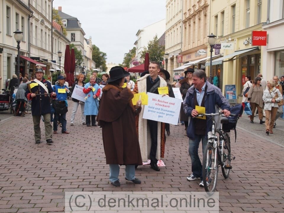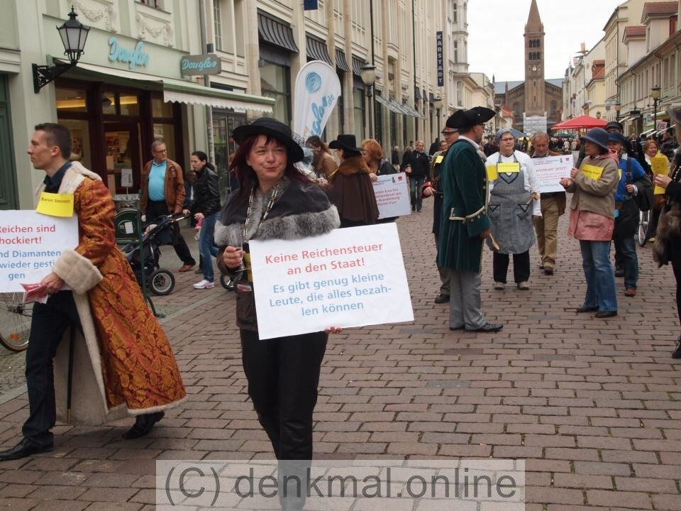 2012 haben wir von ver.di in Potsdam eine tolle Kampagne gestaltet. Das bis heute wichtige Thema einer Reichensteuer oder Vermögensabgabe oder wie man das seit vielen Jahren auch immer nennt, haben wir spielerisch als Straßentheater in der Landeshauptstadt dargeboten. Das "Drehbuch" habe ich selbst geschrieben, die ganzen Kostüme und die Ausstattung haben wir aus dem Fundus der DEFA-Studios in Berlin-Adlershof ausgeliehen. Die "Schauspieler" waren haupt- und ehrenamtliche Gewerkschafter aus meinem damaligen Bezirk.