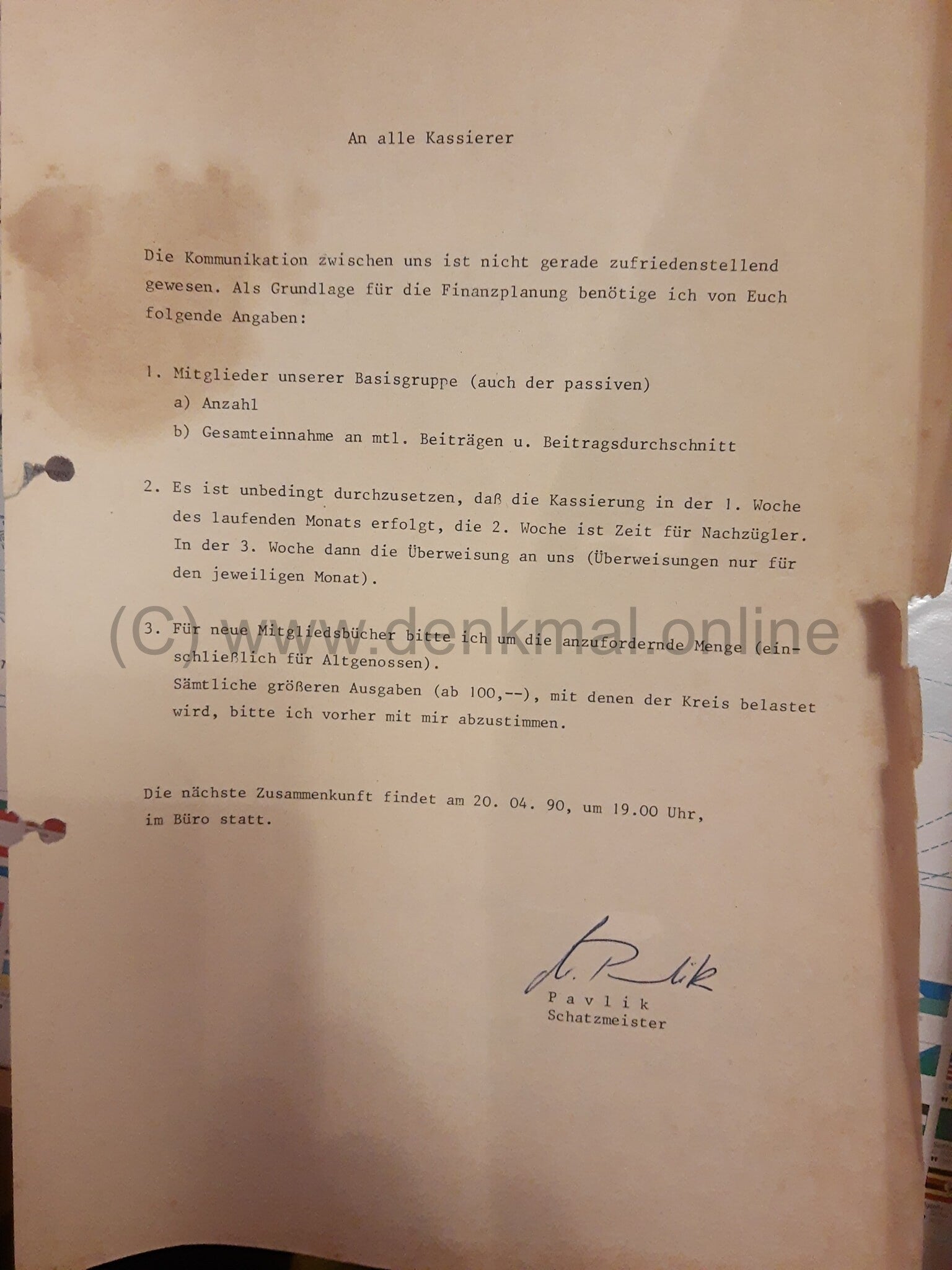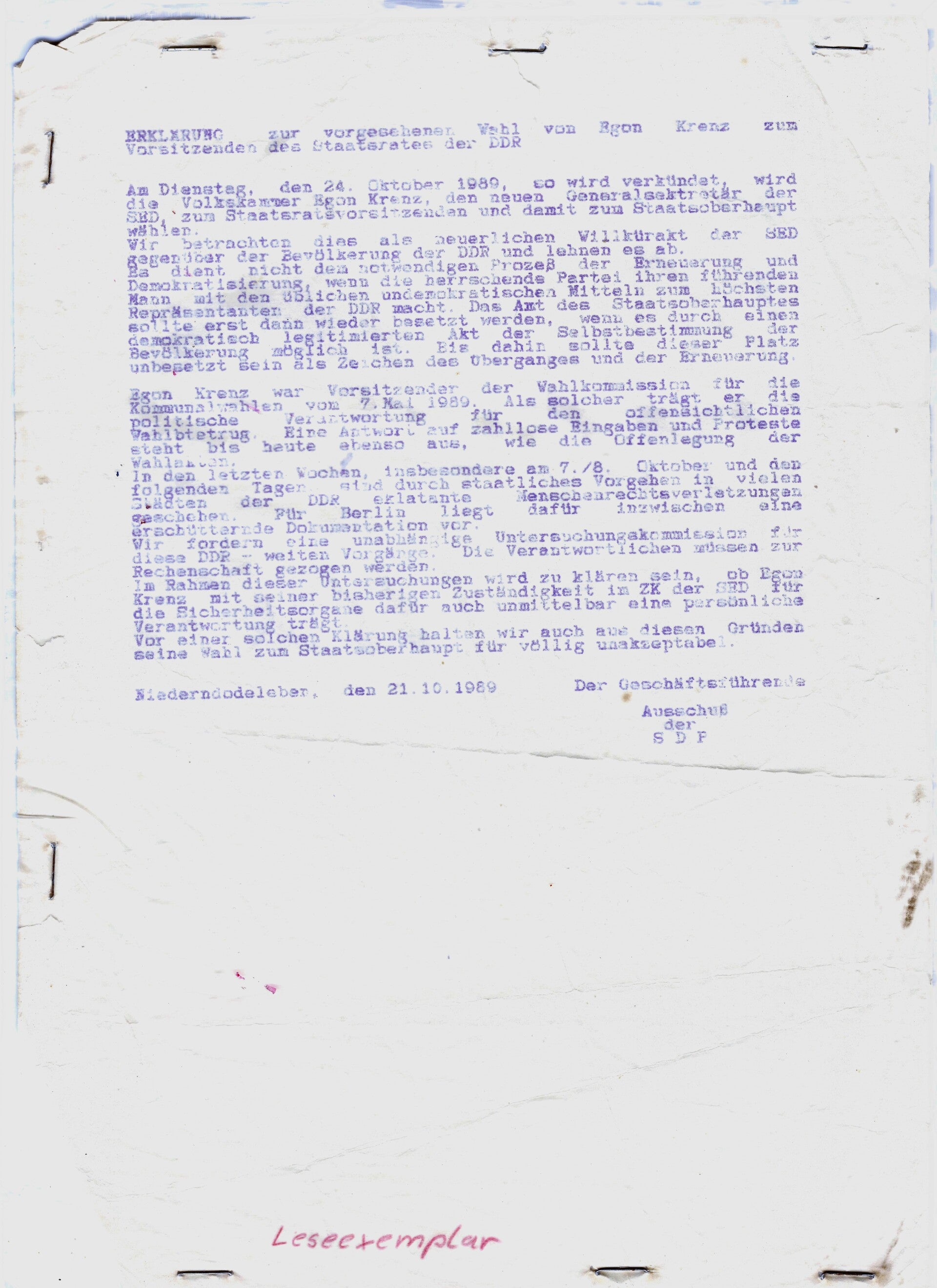Mitte Oktober finde ich eines der vielen auf Ormig in schlecht lesbarem Lila-blau kopierten Flugblätter der jungen Sozialdemokratischen Partei in der DDR, die sich Tage zuvor gegründet hatte. In der Kirche hatte ich bereits ihren Geschäftsführer, Ibrahim Böhme erlebt und war von den Ideen eines neuen freiheitlichen Staates mit Demokratie und Bürgerrechten fasziniert. Ich nahm Kontakt auf, es war die Familie des Töpfermeisters Christian Richter in Niederschönhausen auf. Sein Sohn Oliver nahm mich nach einem ausführlichen Gespräch in die Partei auf. Im Oktober gründeten wir, etwa 25 Menschen, auf dem Teppich im Wohnzimmer der Richters sitzend, den "Bezirksverband Pankow der SDP". Selbstverständlich war ich auch bei der ersten offiziell genehmigten Demonstration und Kundgebung am 4. November 1989 dabei und am folgenden Tag, als wir, ich weiß nicht mehr, vielleicht um die 150 Menschen, in der Sophienkirche in Berlin (Sophienstraße) den Bezirksverband Berlin gründeten.