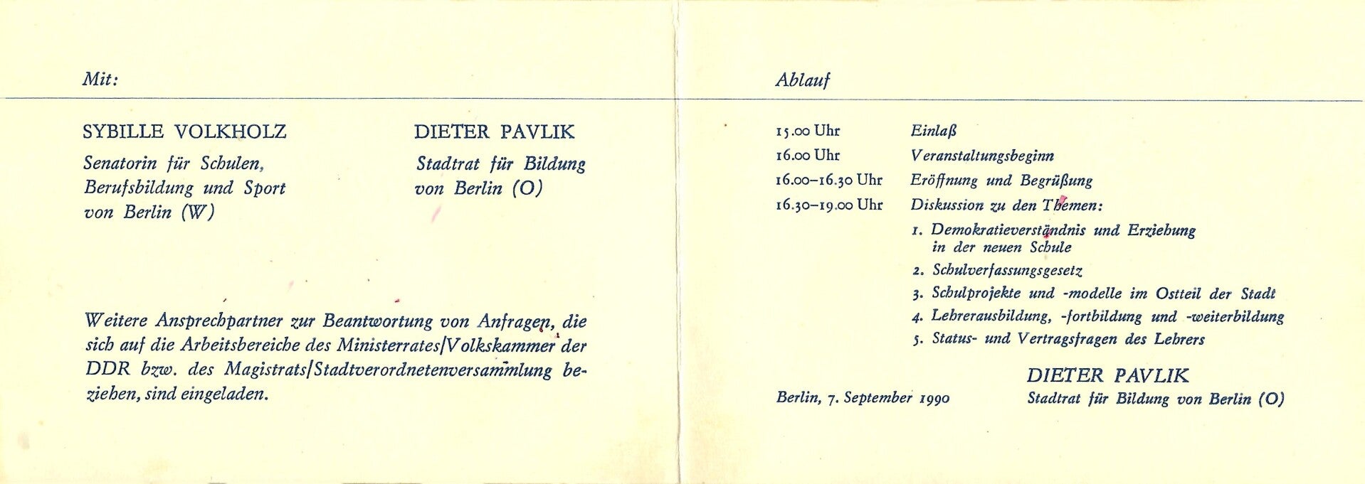 An diesem 24. September 1990, es war zufällig der 55. Geburtstag meines Vaters, eilte ich vom Dienst in der Klosterstraße etwas eher in die Kongresshalle. Ich wollte meinen Vater erleben, wie er über über 1.000 ihm unterstellten Lehrern und Hortnerinnen (so nannte man Horterzieherinnen damals) sprach. Es ging auch um Personalüberhänge und sinkende Schülerzahlen und Vergleiche mit Westberlin. Natürlich gab es Ängste vor dem Verlust des Arbeitsplatzes. Ich saß in der ersten Reihe neben meines Vaters Stellvertreter Peter Koepke, seine Staatssekretär. Mein Vater reagierte auf die vielen Ängste und gab das Versprechen ab, dass niemand in Ostberlin betriebsbedingt gekündigt wird. Der Schulsenatorin Volkholz fiel die Kinnlade runter, im Saal war für eine Sekunde Totenstille, dann brandete hundertfacher Applause auf. Ich rutschte ganz tief in den Sessel und murmelte nur, "Vater, wie kannst du so etwas sagen, die Wahlen stehen erst im Dezember an und keiner weiß, was wird..." Peter Koepke grinste, klopfte mir auf die Schulter und sagte: "Dein Papa weiß schon ganz genau, was er sagt. Vertrau ihm einfach!"